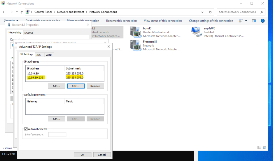 ipconfig. - Find the NIC that has an RFC1918 IP address. (In the example below the adapter is Backend.3 with address 10.0.0.99)